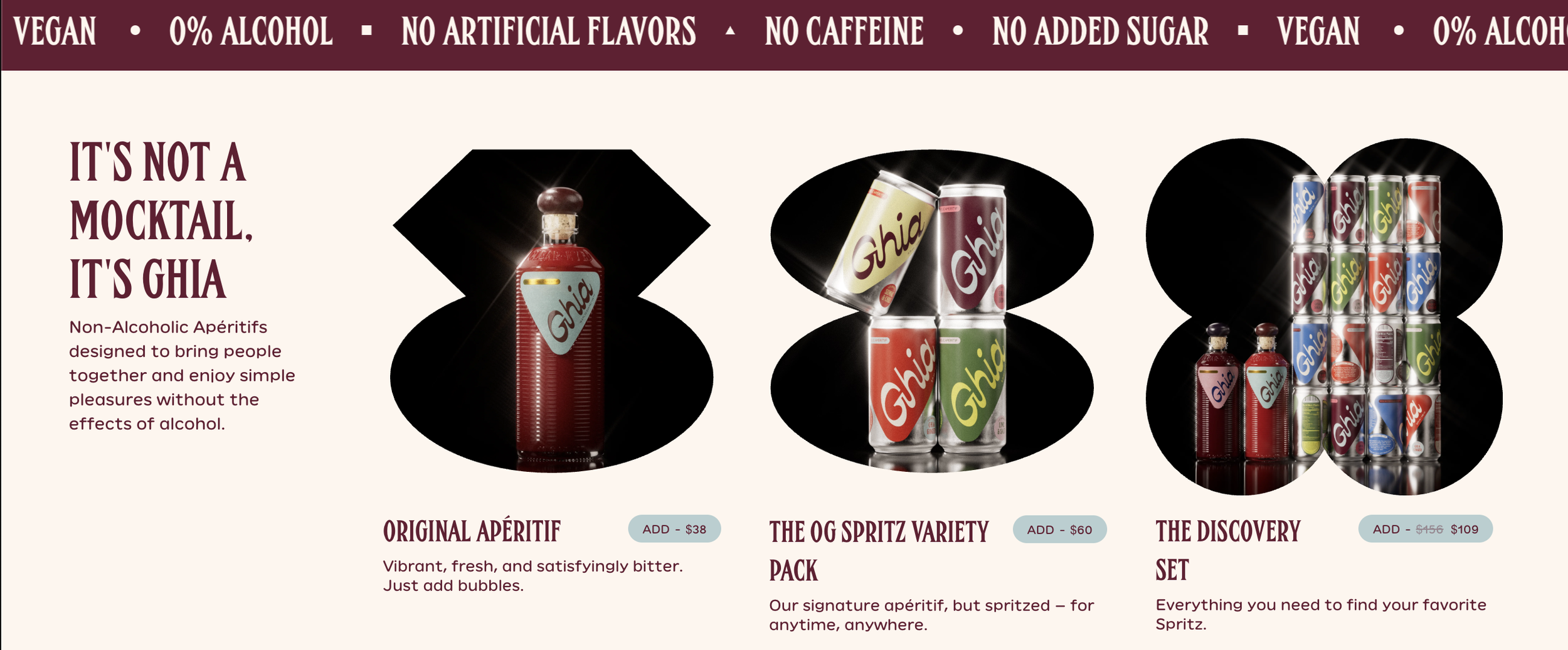 Ghia, a non-alcoholic aperitif brand, has design so consistent it feels like a mood. From the bottle to the website to every Instagram post, it all belongs to one world—lush, analog, elegant, warm. You could spot a Ghia post in a crowded feed. That's not “this brand must spend a lot of marketing dollars”. That's intentional visual strategy rooted in their POV about bringing ritual and beauty back to drinking culture.